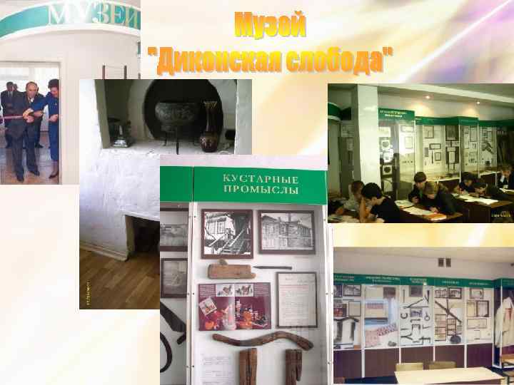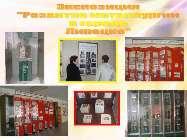 Школьные музеи и экспозиции: стенд «Музыканты Липецкого края» картинная галерея «В каждом рисунке солнце» музей «Диконская слобода» экспозиция «Развитие металлургии в городе Липецке» экспозиция, посвященная Главному маршалу артиллерии и ракетных войск, Герою Советского Союза М. И. Неделину экспозиция «Родники педагогического труда» выставочный зал «Герои живут рядом» кабинет «Литературное краеведение»
