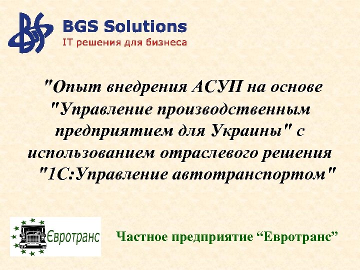 Спасибо за внимание! Компания BGS Solutions г. Киев, ул. Константиновская, 2 А, 2 этаж тел. : (044) 502 -69 -08 office@bgs-solutions. com. ua www. bgs-solutions. com. ua Частное предприятие “Евротранс”