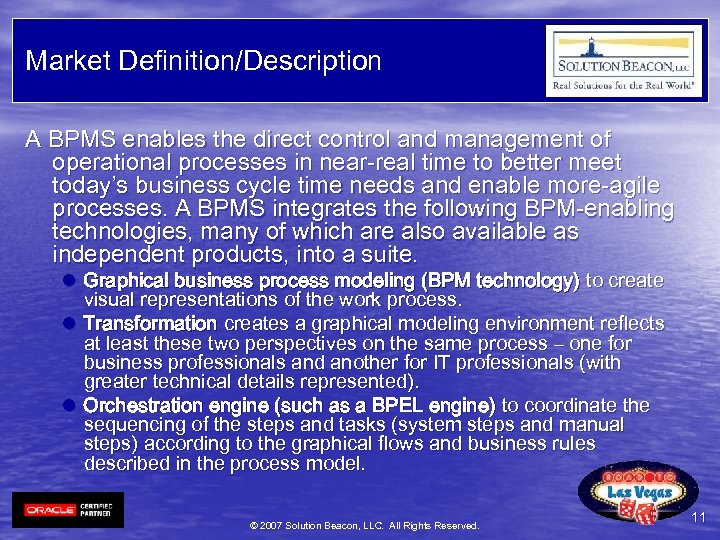 Market Definition/Description A BPMS enables the direct control and management of operational processes in near-real time to better meet today’s business cycle time needs and enable more-agile processes. A BPMS integrates the following BPM-enabling technologies, many of which are also available as independent products, into a suite. l Graphical business process modeling (BPM technology) to create visual representations of the work process. l Transformation creates a graphical modeling environment reflects at least these two perspectives on the same process – one for business professionals and another for IT professionals (with greater technical details represented). l Orchestration engine (such as a BPEL engine) to coordinate the sequencing of the steps and tasks (system steps and manual steps) according to the graphical flows and business rules described in the process model. © 2007 Solution Beacon, LLC. All Rights Reserved. 11