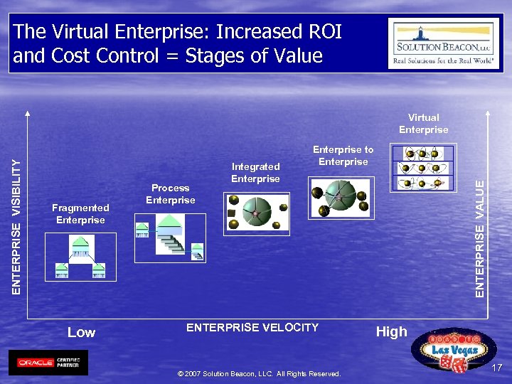 The Virtual Enterprise: Increased ROI and Cost Control = Stages of Value Fragmented Enterprise Low Process Enterprise Integrated Enterprise to Enterprise ENTERPRISE VELOCITY © 2007 Solution Beacon, LLC. All Rights Reserved. ENTERPRISE VALUE ENTERPRISE VISIBILITY Virtual Enterprise High 17