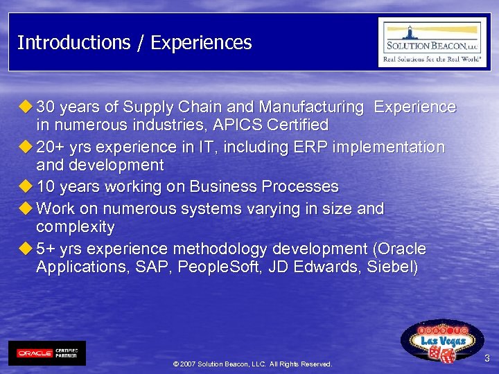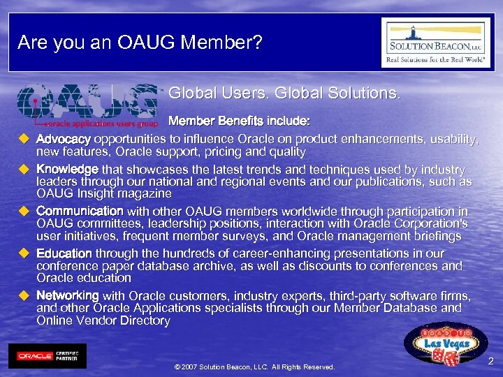 Are you an OAUG Member? Global Users. Global Solutions. u u u Member Benefits include: Advocacy opportunities to influence Oracle on product enhancements, usability, new features, Oracle support, pricing and quality Knowledge that showcases the latest trends and techniques used by industry leaders through our national and regional events and our publications, such as OAUG Insight magazine Communication with other OAUG members worldwide through participation in OAUG committees, leadership positions, interaction with Oracle Corporation's user initiatives, frequent member surveys, and Oracle management briefings Education through the hundreds of career-enhancing presentations in our conference paper database archive, as well as discounts to conferences and Oracle education Networking with Oracle customers, industry experts, third-party software firms, and other Oracle Applications specialists through our Member Database and Online Vendor Directory © 2007 Solution Beacon, LLC. All Rights Reserved. 2