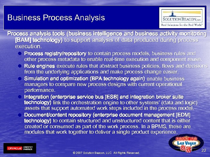 Business Process Analysis Process analysis tools (business intelligence and business activity monitoring [BAM] technology) to support analysis of data produced during process execution. l Process registry/repository to contain process models, business rules and other process metadata to enable real-time execution and component reuse. l Rule engines execute rules that abstract business policies, flows and decisions from the underlying applications and make process change easier. l Simulation and optimization (BPA technology again) enable business managers to compare new process designs with current operational performance. l Integration (enterprise service bus [ESB] and integration broker suite technology) link the orchestration engine to other systems’ (data and logic) assets that support automated work steps included in the process model. l Document/content repository (enterprise document management [EDM] technology) to contain structured and unstructured content that is either created or consumed as part of the work process. In a BPMS, these are modules that work together to deliver a single product experience. © 2007 Solution Beacon, LLC. All Rights Reserved. 22