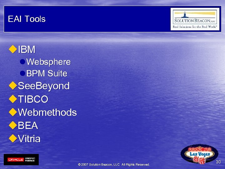 EAI Tools u. IBM l Websphere l BPM Suite u. See. Beyond u. TIBCO u. Webmethods u. BEA u. Vitria © 2007 Solution Beacon, LLC. All Rights Reserved. 30