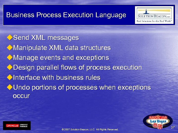 Business Process Execution u. Define Business Process u. Coordinate transactions through rules l Distribute long-running transactions l Directly connecting transaction services u. Monitor success or failure of transactions u. Benefits l Built on top of Web Services l Extensible l Flexible l Durable and reliable Handles complexity in consistent way © 2007 Solution Beacon, LLC. All Rights Reserved. 36