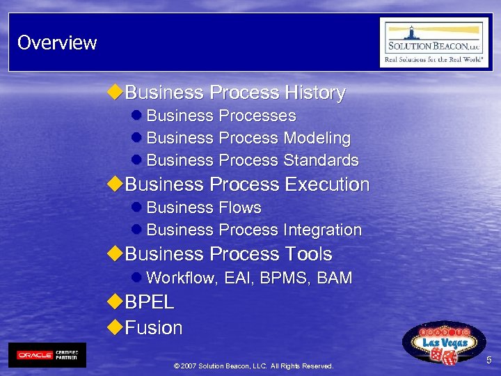 Audience Profile u Technical l DB Version l Application Version u Functional l Current Application l Product Suites u Business Processes l l Number Modeled State of Automation Tools deployed Level of Integration © 2007 Solution Beacon, LLC. All Rights Reserved. 4