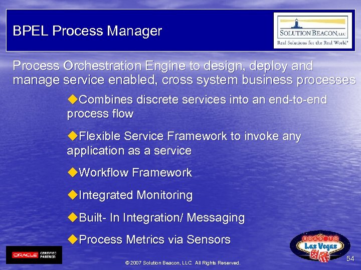 BPEL Process Manager Process Orchestration Engine to design, deploy and manage service enabled, cross system business processes u. Combines discrete services into an end-to-end process flow u. Flexible Service Framework to invoke any application as a service u. Workflow Framework u. Integrated Monitoring u. Built- In Integration/ Messaging u. Process Metrics via Sensors © 2007 Solution Beacon, LLC. All Rights Reserved. 54