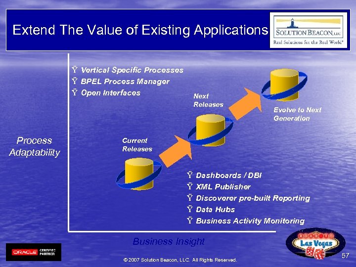 Path to Fusion Protect Current Applications Portfolio Leverage Current Applications Take advantage of new support policy Extend Value with Incremental Applications Upgrade to Current Release(s) Add New Application(s) Leverage Oracle Fusion Middleware Evolve to Next Generation Application Suite Built on Fusion Middleware in Fusion Architecture © 2007 Solution Beacon, LLC. All Rights Reserved. 56
