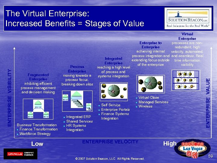 Fragmented Enterprise inhibiting efficient process management and decision making Process Enterprise moving towards a process focus, breaking down silos Integrated Enterprise reaching a high level of process and systems integration Virtual Enterprise to processes are non. Enterprise redundant, high achieving internal velocity, automated, process integration and seamless. Real extending focus outside time information of the enterprise visibility n n Business Transformation n Finance Transformation n Workforce Strategy Low n n Integrated ERP Shared Services HR Systems Integration n Self Service Enterprise Portals Finance Systems Integration n n Virtual Close Managed Services Wireless ENTERPRISE VELOCITY © 2007 Solution Beacon, LLC. All Rights Reserved. ENTERPRISE VALUE ENTERPRISE VISIBILITY The Virtual Enterprise: Increased Benefits = Stages of Value High 59