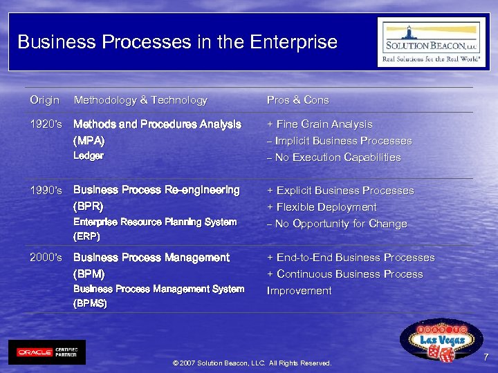 Information Sources u. BPMI. org, BPMS Report Series u. Business Process Trends, IBM’s BPM Strategy, Products and Architecture u. Gartner, BPA and BPM Magic Quadrants 2002/2006 u. Oracle Keynote, Fusion Effect u. Oracle BPEL Process Manager Developer’s Guide, 10 g Release 2 (10. 1. 2) u. Infoconomist, Dec 10, 2002 © 2007 Solution Beacon, LLC. All Rights Reserved. 61