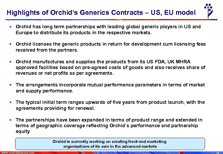 Formulation Facilities – Advanced Markets (Irungattukottai, Chennai) n Large state-of-the-art oral dosage form complex with multi-therapeutic facilities n World-class facilities with US FDA & UK MHRA and other international regulatory approvals n High throughput Oral cephalosporin formulations facility n Pilot and commercial scale NPNC (non-antibiotic) dosage forms plant n Global scale capacities www. orchidpharma. com 9