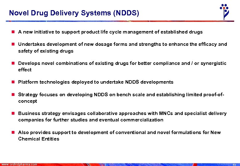 Highlights of Orchid’s Generics Contracts – US, EU model § Orchid has long term partnerships with leading global generic players in US and Europe to distribute its products in the respective markets. § Orchid licenses the generic products in return for development cum licensing fees received from the partners. § Orchid manufactures and supplies the products from its US FDA, UK MHRA approved facilities based on pre-agreed costs of goods and also receives share of revenues or net profits as per agreements. § The arrangements incorporate mutual performance parameters in terms of market and supply performance. § The typical initial term ranges upwards of five years from product launch, with the agreements providing for renewal. § The partnerships have been expanded in terms of product range and extended in terms of geographic coverage reflecting Orchid’s performance and partnership equity Orchid is currently working on creating front-end marketing organisations of its own in the advanced markets www. orchidpharma. com 10