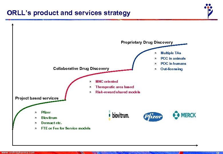 Orchid Research Laboratories Ltd (ORLL) n Animal House facility n IPM n Microbiology Facility n Medicinal Chemistry n Microbiology Capabilities: MRO Analytical Chemistry n Process Research & Development n Assay Development n Microbiology in vivo capabilities n Microbiology in vitro functional capabilities n Pre-Form/Formulation and DMPK n Special competencies n n High quality infrastructure Molecular modeling Toxicology Capabilities n GLP Cert ified Microbiology in vitro hit profiling n Access to Parent’s Process Research capabilities and Pharma Research infrastructure § 130 plus scientists exclusively for drug discovery and drug biology. Supported by access to the parent’s process research and pharmaceutical capabilities, as needed § Has the capability to link up with clinical research organizations for human clinicals Orchid’s integrated drug discovery and development infrastructure helps simultaneous, fast-track pursuit of multiple therapeutic programs www. orchidpharma. com 13