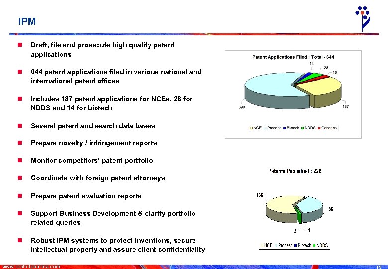 IPM n Draft, file and prosecute high quality patent applications n 644 patent applications filed in various national and international patent offices n Includes 187 patent applications for NCEs, 28 for NDDS and 14 for biotech n Several patent and search data bases n Prepare novelty / infringement reports n Monitor competitors’ patent portfolio n Coordinate with foreign patent attorneys n Prepare patent evaluation reports n Support Business Development & clarify portfolio related queries n Robust IPM systems to protect inventions, secure intellectual property and assure client confidentiality www. orchidpharma. com 15