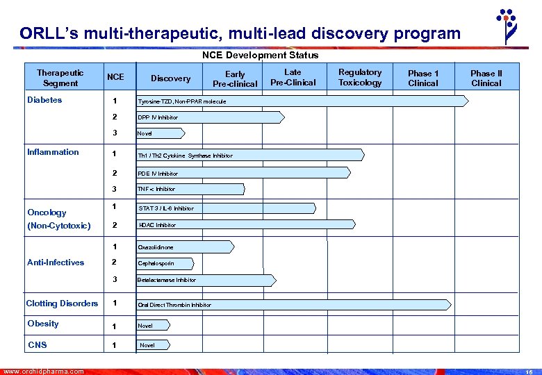 ORLL’s product and services strategy Proprietary Drug Discovery ä ä Out-licensing Therapeutic area based ä POC in humans MNC oriented ä PCC in animals ä Collaborative Drug Discovery Multiple TAs Risk-reward shared models Project based services ä ä Biovitrum ä Dermact etc. ä www. orchidpharma. com Pfizer FTE or Fee for Service models 14
