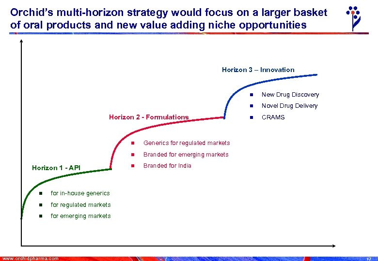 Orchid’s multi-horizon strategy would focus on a larger basket of oral products and new value adding niche opportunities Horizon 3 – Innovation n n Horizon 2 - Formulations n Horizon 1 - API n Branded for India for regulated markets n CRAMS for in-house generics n n Branded for emerging markets n Novel Drug Delivery Generics for regulated markets n New Drug Discovery for emerging markets www. orchidpharma. com 17