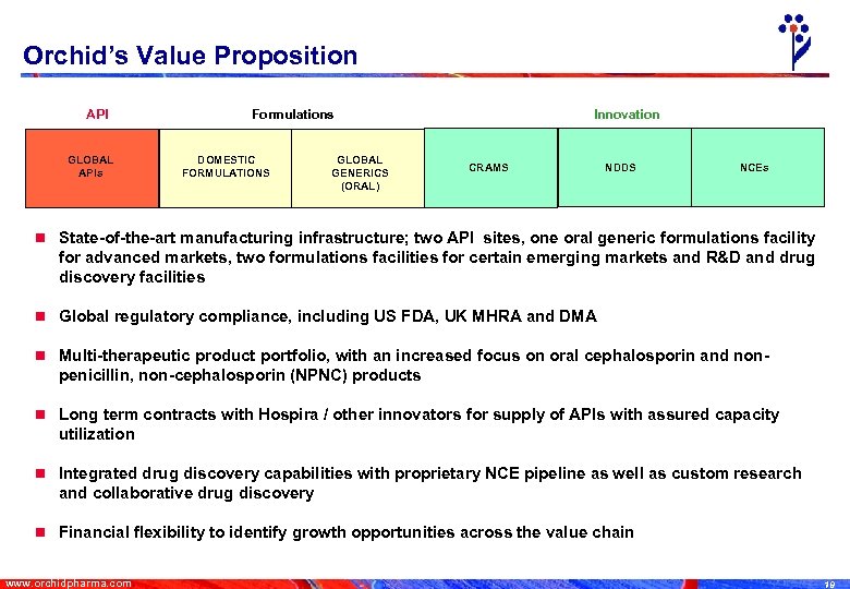 Growth strategy Orchid Existing Business API / Oral FDF / CRAMS / NDDS Inorganic Strategies (Front-end Mktg / in-licensing of products) New niche Initiatives (New product segments) n Target to grow topline by 15 -20% y-o-y n Strong operational cash flow going forward based on niche product opportunities n Orchid recently acquired US-based marketing company Karalex Pharma, LLC. www. orchidpharma. com 18