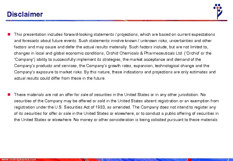 Disclaimer n This presentation includes forward-looking statements / projections, which are based on current expectations and forecasts about future events. Such statements involve known / unknown risks, uncertainties and other factors and may cause and defer the actual results materially. Such factors include, but are not limited to, changes in local and global economic conditions, Orchid Chemicals & Pharmaceuticals Ltd. (‘Orchid’ or the ‘Company’) ability to successfully implement its strategies, the market acceptance and demand of the Company’s products and services, the Company’s growth rates, expansion, technological change and the Company’s exposure to market risks. By this nature, these indications and projections are only estimates and actual results could differ from these in the future. n These materials are not an offer for sale of securities in the United States or in any other jurisdiction. No securities of the Company may be offered or sold in the United States absent registration or an exemption from registration under the U. S. Securities Act of 1933, as amended. The Company does not intend to register any of its securities for offer or sale in the United States or elsewhere, or to conduct a public offering of securities in the United States or elsewhere. No money or other consideration is being solicited pursuant to these materials. www. orchidpharma. com 2