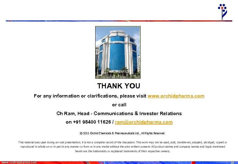 THANK YOU For any information or clarifications, please visit www. orchidpharma. com or call Ch Ram, Head - Communications & Investor Relations on +91 98400 11626 / ram@orchidpharma. com © 2011 Orchid Chemicals & Pharmaceuticals Ltd. , All Rights Reserved. This material was used during an oral presentation; it is not a complete record of the discussion. This work may not be used, sold, transferred, adapted, abridged, copied or reproduced in whole on or in part in any manner or form or in any media without the prior written consent. All product names and company names and logos mentioned herein are the trademarks or registered trademarks of their respective owners. www. orchidpharma. com 20