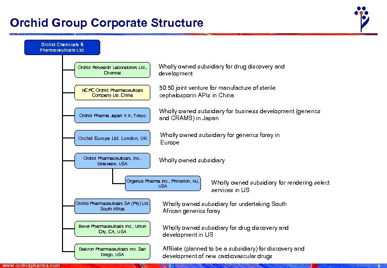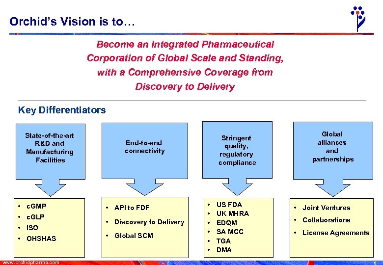 Orchid’s Domain Leadership n Leader in high technology life-saving antibiotics ; cephalosporins, penicillins / betalactams and carbapenems n Complex non-penicillin, non-cephalosporin products Presence Amongst the Top-15 Indian pharma companies, a status achieved in just 13 years of operations Amongst the Top-5 cephalosporin antibiotic producers of the world Largest manufacturer-exporter of cephalosporin products in India; Amongst the top exporters of all pharmaceutical products in India Committed to a culture of high standards in safety, health and environment Recipient of several awards from Government of India, Confederation of Indian Industry, Madras Management Association and other national and international agencies Partner of Choice for ‘Competitive Excellence’ & ‘Contract Research - Collaborative Drug Discovery’ awarded by Frost & Sullivan www. orchidpharma. com 4