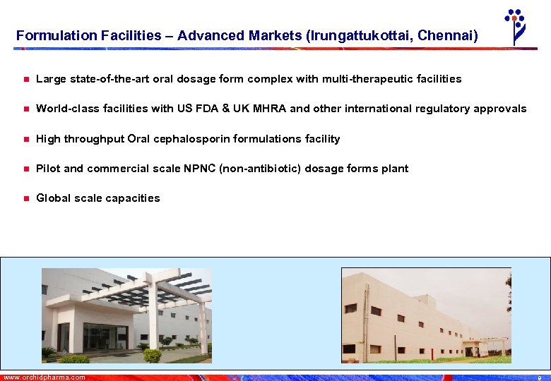 API facilities (Aurangabad) n Multi-site API complex with dedicated facilities for ä Penicillins ä Sterile Carbapenems ä Non-penicillin, Non-cephalosporins (NPNC) n Manufacturing capacities : 48 MT for Penicillins, 12 MT for Sterile Carbapenems and 120 MT for NPNC n ISPE, INTERPHEX and Pharmaceutical Processing Facility Awards 2009 Facilities designed for automated production n Sterile Carbapenem Facility Approvals: ä UK MHRA (Approved - Jan ’ 07) ä US FDA (Approved - Feb ’ 07) ä OHSAS 18001: 1999 ä Danish Medicines Agency [EU-GMP] (Approved - Jan ’ 09) ä WHO GMP Audit (Approved - Apr ‘ 10) www. orchidpharma. com 8