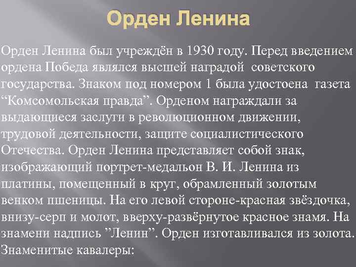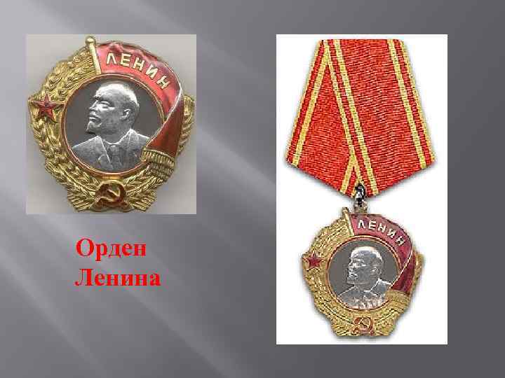 Орден Ленина был учреждён в 1930 году. Перед введением ордена Победа являлся высшей наградой советского государства. Знаком под номером 1 была удостоена газета “Комсомольская правда”. Орденом награждали за выдающиеся заслуги в революционном движении, трудовой деятельности, защите социалистического Отечества. Орден Ленина представляет собой знак, изображающий портрет-медальон В. И. Ленина из платины, помещенный в круг, обрамленный золотым венком пшеницы. На его левой стороне-красная звёздочка, внизу-серп и молот, вверху-развёрнутое красное знамя. На знамени надпись ”Ленин”. Орден изготавливался из золота. Знаменитые кавалеры: