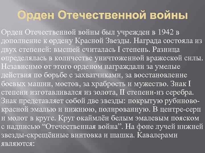 Орден Отечественной войны был учрежден в 1942 в дополнение к ордену Красной Звезды. Награда состояла из двух степеней: высшей считалась I степень. Разница определялась в количестве уничтоженной вражеской силы. Независимо от этого орденом награждали за умелые действия по борьбе с захватчиками, за восстановление боевых машин, мостов, за храбрость и мужество. Знак I степени изготавливался из золота, II степени-из серебра. Знак представляет собой две звезды: покрытую рубиновокрасной эмалью и нижнюю, полированную. В центре-серп и молот в круге. Круг окаймлён белым эмалевым пояском с надписью “Отечественная война”. На фоне лучей нижней звезды-скрещённые винтовка и шашка. Кавалерами являются: