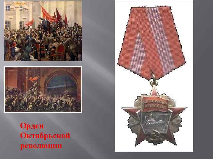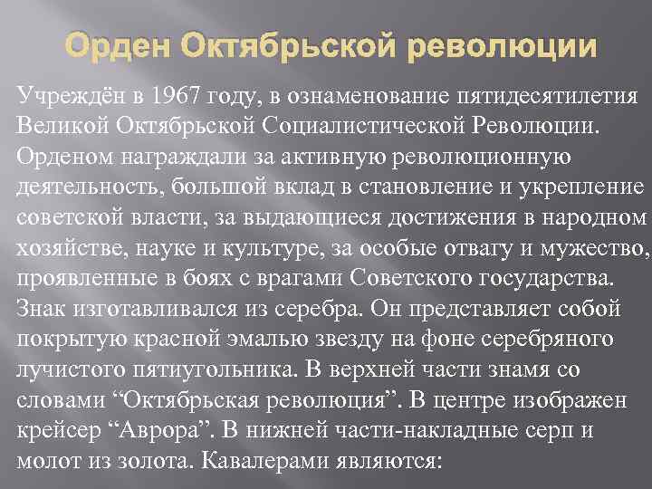 Орден Октябрьской революции Учреждён в 1967 году, в ознаменование пятидесятилетия Великой Октябрьской Социалистической Революции. Орденом награждали за активную революционную деятельность, большой вклад в становление и укрепление советской власти, за выдающиеся достижения в народном хозяйстве, науке и культуре, за особые отвагу и мужество, проявленные в боях с врагами Советского государства. Знак изготавливался из серебра. Он представляет собой покрытую красной эмалью звезду на фоне серебряного лучистого пятиугольника. В верхней части знамя со словами “Октябрьская революция”. В центре изображен крейсер “Аврора”. В нижней части-накладные серп и молот из золота. Кавалерами являются:
