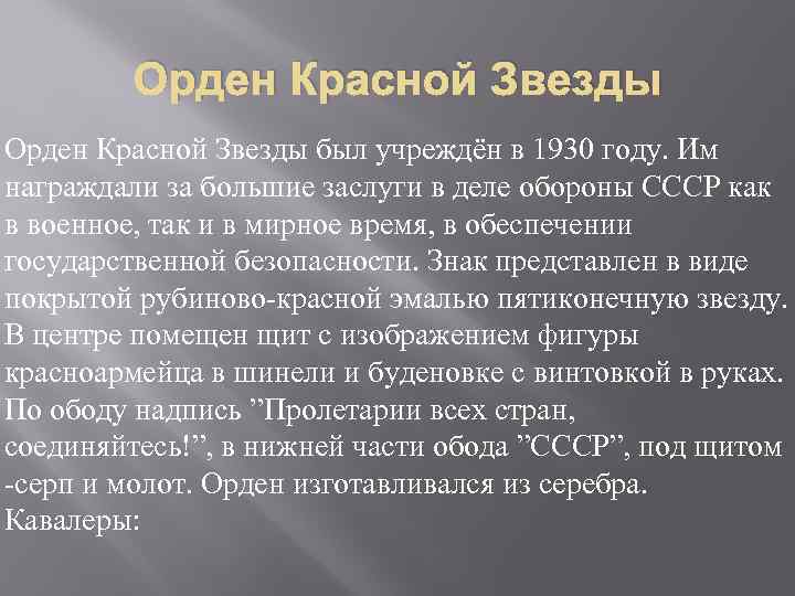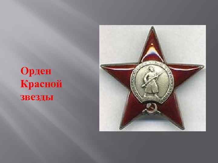 Орден Красной Звезды был учреждён в 1930 году. Им награждали за большие заслуги в деле обороны СССР как в военное, так и в мирное время, в обеспечении государственной безопасности. Знак представлен в виде покрытой рубиново-красной эмалью пятиконечную звезду. В центре помещен щит с изображением фигуры красноармейца в шинели и буденовке с винтовкой в руках. По ободу надпись ”Пролетарии всех стран, соединяйтесь!”, в нижней части обода ”СССР”, под щитом -серп и молот. Орден изготавливался из серебра. Кавалеры: