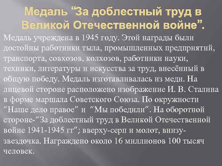 Медаль “За доблестный труд в Великой Отечественной войне”. Медаль учреждена в 1945 году. Этой награды были достойны работники тыла, промышленных предприятий, транспорта, совхозов, колхозов, работники науки, техники, литературы и искусства за труд, внесённый в общую победу. Медаль изготавливалась из меди. На лицевой стороне расположено изображение И. В. Сталина в форме маршала Советского Союза. По окружности “Наше дело правое” и “Мы победили”. На оборотной стороне-“За доблестный труд в Великой Отечественной войне 1941 -1945 гг”; вверху-серп и молот, внизузвездочка. Награждено около 16 миллионов 100 тысяч человек.