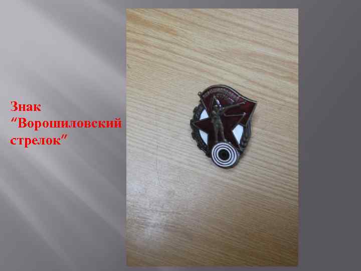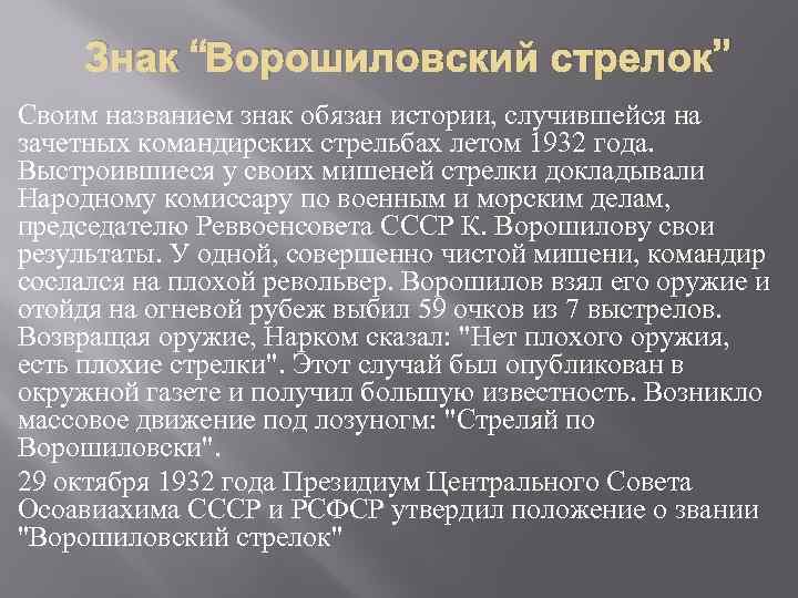 Знак “Ворошиловский стрелок” Своим названием знак обязан истории, случившейся на зачетных командирских стрельбах летом 1932 года. Выстроившиеся у своих мишеней стрелки докладывали Народному комиссару по военным и морским делам, председателю Реввоенсовета СССР К. Ворошилову свои результаты. У одной, совершенно чистой мишени, командир сослался на плохой револьвер. Ворошилов взял его оружие и отойдя на огневой рубеж выбил 59 очков из 7 выстрелов. Возвращая оружие, Нарком сказал: "Нет плохого оружия, есть плохие стрелки". Этот случай был опубликован в окружной газете и получил большую известность. Возникло массовое движение под лозуногм: "Стреляй по Ворошиловски". 29 октября 1932 года Президиум Центрального Совета Осоавиахима СССР и РСФСР утвердил положение о звании "Ворошиловский стрелок"
