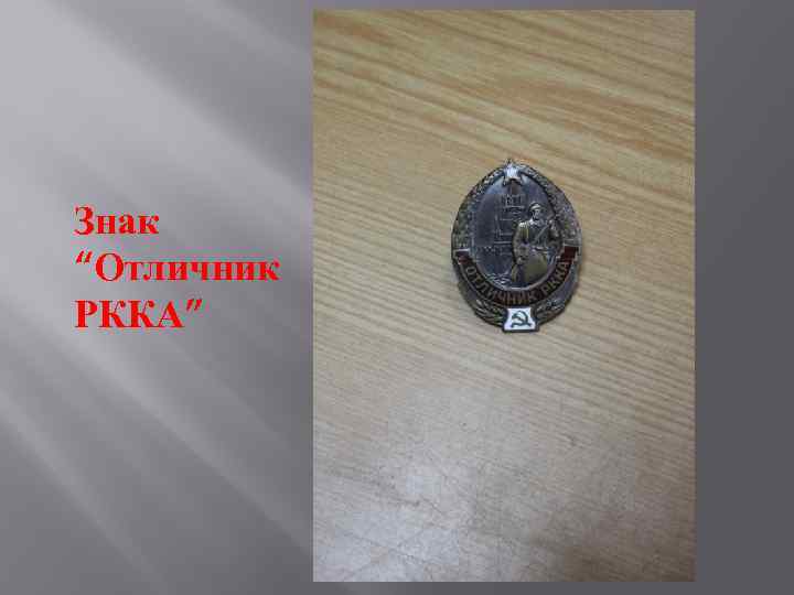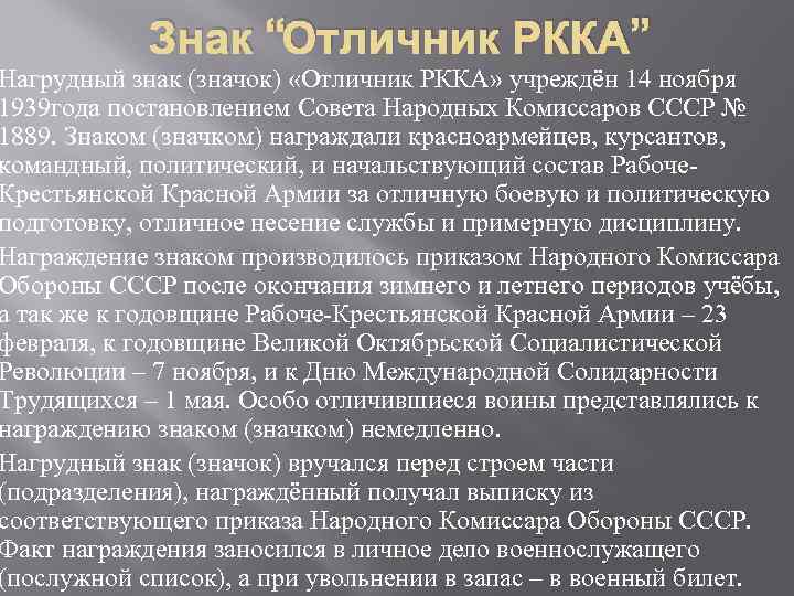 Знак “Отличник РККА” Нагрудный знак (значок) «Отличник РККА» учреждён 14 ноября 1939 года постановлением Совета Народных Комиссаров СССР № 1889. Знаком (значком) награждали красноармейцев, курсантов, командный, политический, и начальствующий состав Рабоче. Крестьянской Красной Армии за отличную боевую и политическую подготовку, отличное несение службы и примерную дисциплину. Награждение знаком производилось приказом Народного Комиссара Обороны СССР после окончания зимнего и летнего периодов учёбы, а так же к годовщине Рабоче-Крестьянской Красной Армии – 23 февраля, к годовщине Великой Октябрьской Социалистической Революции – 7 ноября, и к Дню Международной Солидарности Трудящихся – 1 мая. Особо отличившиеся воины представлялись к награждению знаком (значком) немедленно. Нагрудный знак (значок) вручался перед строем части (подразделения), награждённый получал выписку из соответствующего приказа Народного Комиссара Обороны СССР. Факт награждения заносился в личное дело военнослужащего (послужной список), а при увольнении в запас – в военный билет.