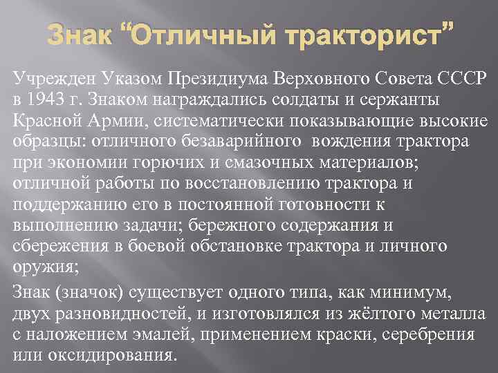 Знак “Отличный тракторист” Учрежден Указом Президиума Верховного Совета СССР в 1943 г. Знаком награждались солдаты и сержанты Красной Армии, систематически показывающие высокие образцы: отличного безаварийного вождения трактора при экономии горючих и смазочных материалов; отличной работы по восстановлению трактора и поддержанию его в постоянной готовности к выполнению задачи; бережного содержания и сбережения в боевой обстановке трактора и личного оружия; Знак (значок) существует одного типа, как минимум, двух разновидностей, и изготовлялся из жёлтого металла с наложением эмалей, применением краски, серебрения или оксидирования.