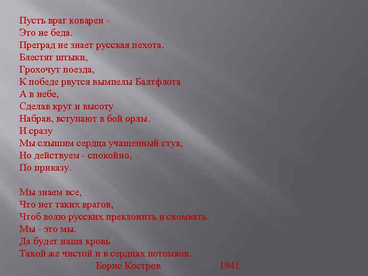 Пусть враг коварен Это не беда. Преград не знает русская пехота. Блестят штыки, Грохочут поезда, К победе рвутся вымпелы Балтфлота А в небе, Сделав круг и высоту Набрав, вступают в бой орлы. И сразу Мы слышим сердца учащенный стук, Но действуем - спокойно, По приказу. Мы знаем все, Что нет таких врагов, Чтоб волю русских преклонить и скомкать. Мы - это мы. Да будет наша кровь Такой же чистой и в сердцах потомков. Борис Костров 1941