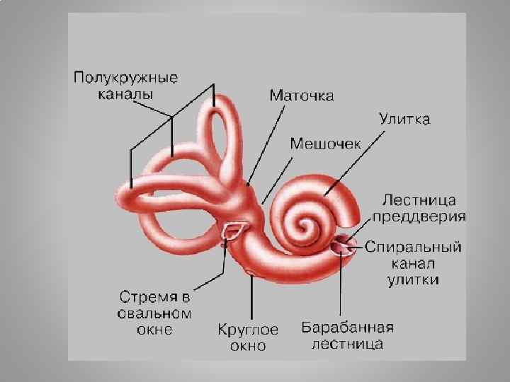 Четыре рецепторных образования: Отдел внутреннего уха Название рецепторного поля функции улитка Спиральный (кортиев) орган Звуковосприятие Эллиптический мешочек преддверия пятна Восприятие гравитации Сферический мешочек преддверия пятна Восприятие гравитации и вибрации Ампулы полукружных каналов Ампулярные гребешки Восприятие угловых ускорений
