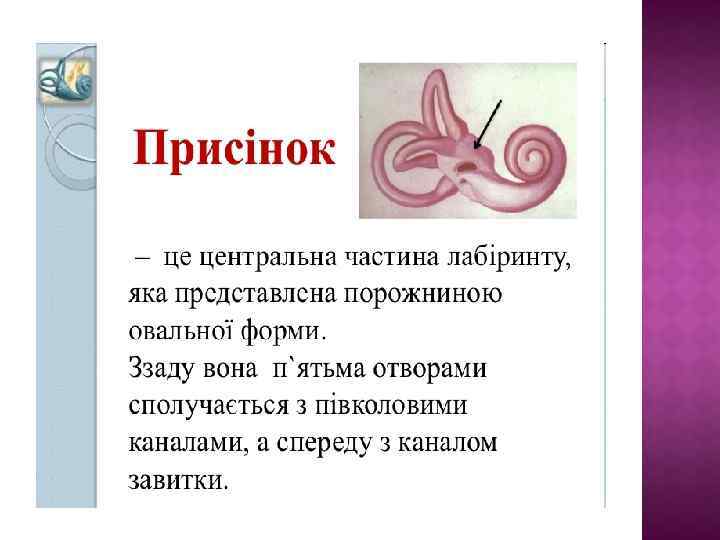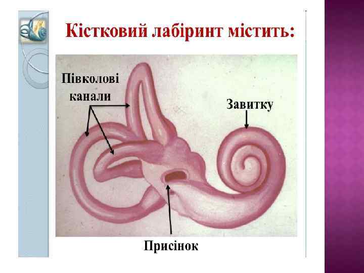 Присінок і півколові канали — органи відчуття рівноваги і положення тіла в просторі. Півколові канали розташовані у трьох взаємно перпендикулярних площинах і заповнені напівпрозорою драглистою рідиною; всередині каналів знаходяться чутливі волоски, занурені в рідину, і при найменшому переміщенні тіла або голови в просторі рідина в цих каналах зміщується, натискає на волоски і породжує імпульси в закінченнях вестибулярного нерва — в мозок надходить інформація про зміну положення тіла. Робота вестибулярного апарату дозволяє людині точно орієнтуватися в просторі. Найвіть при найскладніших рухах — наприклад, стрибнувши у воду з трампліну і при цьому кілька разів перекинувшись в повітрі, у воді пірнач миттєво дізнається, де знаходиться верх, а де низ.