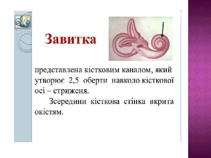 Звукові хвилі, які з зовнішнього слухового проходу через середнє вухо потрапляють у внутрішній слуховий прохід, у вигляді вібрації передаються рідині, що заповнює завитку. Всередині завитка знаходиться основна мембрана (нижня перетинчаста стінка), на якій розташований кортіїв орган — скупчення особливих слухових волоскових клітин, які через коливання перилімфи сприймають слухові подразнення в діапазоні 16 -20 000 Гц, перекодовують їх у нервові імпульси і передають на нервові закінчення VIII пари черепномозкових нервів — присінковозавиткового нерва; далі нервовий імпульс надходить у корковий слуховий центр головного мозку.