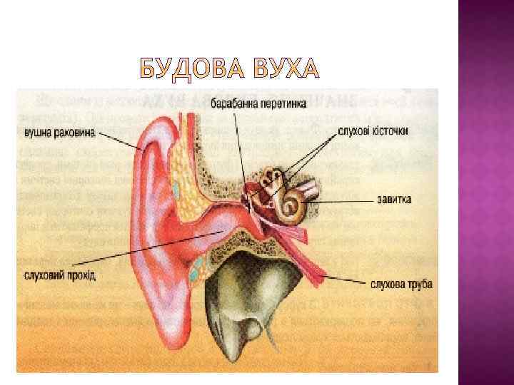 вушна раковина зовнішній слуховий прохід. Вушна раковина утворена еластичним хрящем, має характерні завитки, що спрямовують звукові коливання повітря у зовнішній слуховий прохід, у кінці якого є туго натягнута барабанна перетинка. Зовнішній слуховий прохід у дорослої людини завдовжки 2, 5 см. У шкірі слухового проходу є волоски і видозмінені потові залози, що виробляють вушну сірку. Вони виконують захисну функцію (затримують пил і мікроорганізми). Звукові хвилі спричинюють коливання барабанної перетинки, яка передає їх на слухові кісточки середнього вуха. Частота коливання барабанної перетинки тим більша, чим вищий звук.