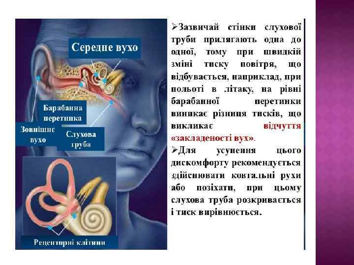 • Орган слуху - вухо - також один з найважливіших органів чуттів, за допомогою якого людина сприймає все багатство звуків навколишнього світу, оволодіває мовою. Втрата або зниження слуху (глухота, приглухуватість) різко обмежує можливості людини у її сприйманні навколишнього світу, знижує потенціал психічного розвитку. Наприклад, діти, які народилися глухими, не можуть оволодіти мовою, хоч мовний апарат у них не порушений. Доросла людина, коли повністю глухне, втрачає більше як 10% зовнішньої інформації. Діти, у яких порушена слухова функція, постійно відчувають труднощі в навчанні, нерідко потребують переведення в спецшколи, і надалі їхні життєві успіхи різко обмежуються. • Нормальне функціонування органа слуху визначається нормальним станом усіх його анатомофізіологічних складових частин, що забезпечують вільне проникнення звуків до нервових приймачів внутрішнього вуха і передавання збудження до мозку.