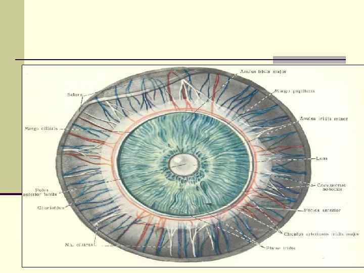 Средняя оболочка глаза n Средняя оболочка глаза – сосудистая или увеальный тракт подразделяется: 1) радужка; 2) ресничное тело; 3) хориоидеа является главным коллектором питания глаза. Сосудистому тракту принадлежит доминирующая роль во внутриглазных обменных процессах.