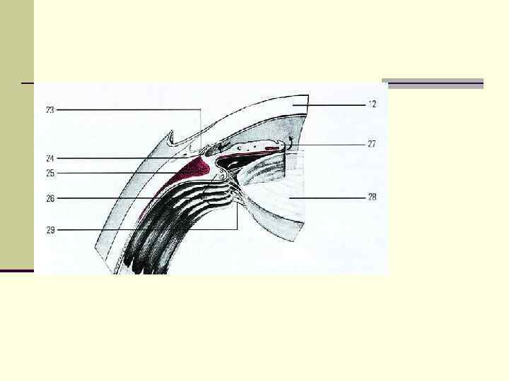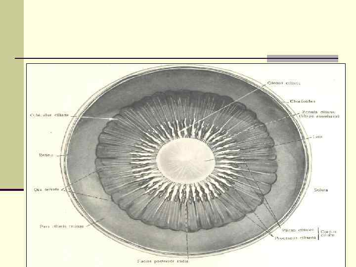 Камеры глаза n Передняя камера (camera anterior oculi) – пространство, переднюю стенку которого образует роговица, заднюю – радужная оболочка, а в области зрачка – центральная часть передней капсулы хрусталика. Место, где роговица переходит в склеру, а радужка – в цилиарное тело называется углом передней камеры. У вершины угла находится поддерживающий остов - корнио-склеральная трабекула. , n Задняя камера расположена позади радужки, которая является ее передней стенкой. Наружной стенкой служит цилиарное тело, задней – передняя поверхность цилиарного тела. Внутреннюю стенку образуют экватор хрусталика. Все пространство задней камеры пронизано фибриллами ресничного пояска, которые поддерживают хрусталик в подвешенном состоянии и соединяют его с цилиарным телом. n Камеры глаза заполнены водянистой влагой – прозрачной бесцветной жидкостью, плотностью 1, 005 -1, 004 с показателем преломления 1, 33. Количество влаги не более 0, 2 -0, 5 мл. Вырабатывается цилиарным телом, содержит соли, следы белка, аскорбиновую кислоту.