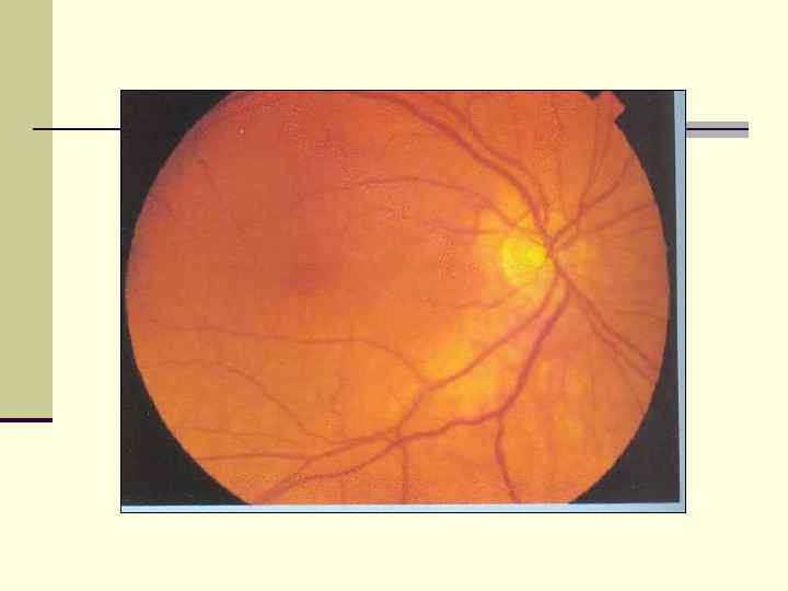 n Оптическая часть сетчатки – это такая прозрачная пластинка, крепко соединенная с подлежащими тканями в 2 -х местах – у зубчатой линии и вокруг зрительного нерва. n Место выхода зрительного нерва из сетчатки называет диск зрительного нерва. На расстоянии 4 мм кнаружи от диска зрительного нерва имеется углубление – так называемое желтое пятно (в зрительной клетке этой оболочке находится желтый пигмент). n Толщина сетчатки около диска – 0, 4 мм, в области желтого пятна – 0, 1 мм.