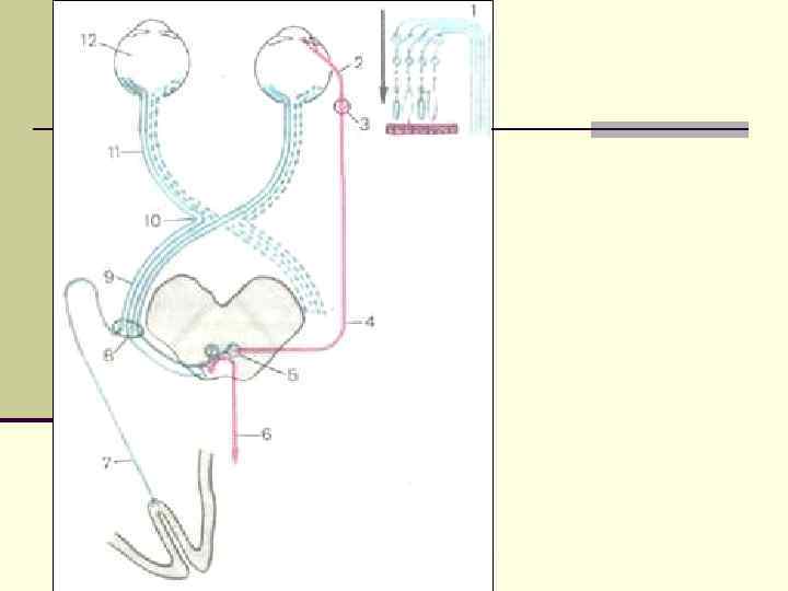 Зрительные пути: n В оптическом проводящем пути различают четыре отрезка: n зрительный нерв n хиазму, в котором соединяются оба зрительных нерва и происходит частичный перекрест их волокон n зрительный тракт n наружные коленчатые тела, зрительная лучистость и оптический центр восприятия