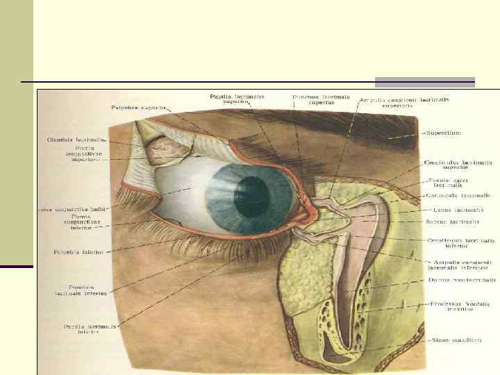 Анатомия и физиология слезных органов n Делятся на слезосекреторный и слезоотводящий аппарат. n К секреторному аппарату относится слезная железа и ряд добавочных мелких железок, рассеянных в слизистой оболочке в сводах конъюнктивальной полости – желез Краузе. n Слезная железа (glandula lacrimalis) располагается под верхнелатеральным краем орбиты в одноименной ямке. Плотным листком тарзо-орбитальной фасции слезная железа разделяется на большую – орбитальную и и меньшую - пальпебральную части. n Выводящие протоки орбитальной части железы проходят между дольками пальпебральной и вместе с протоками последней (всего 15 -20) открываются в наружной половине верхнего конъюнктивального свода. n Кровоснабжение – слезная артерия (от глазничной). Иннервирует слезным нервом (из I ветви тройничного нерва). Симпатические волокна идут от верхнего шейного узла.