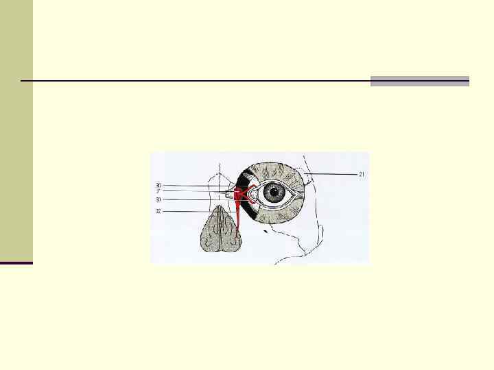 n Кровоснабжение: a. centralis retinae (ветвь a. ophtal…) В области диска длительного нерва центральная артерия сетчатки делится на верхнюю и нижнюю сосочковые артерии. n Отток крови осуществляется центральной веной сетчатки. Область диска зрительного нерва не содержит фоторецепторов и является «слепой зоной» глазного дна. n Проекция диска зрительного нерва на плоскость носит название слепого пятна, или скотомы Бьеррума. Величина и форма это скотомы зависят от размеров диска, составляющих сосудов и окружающей сетчатки и может изменяться при патологических процесса.