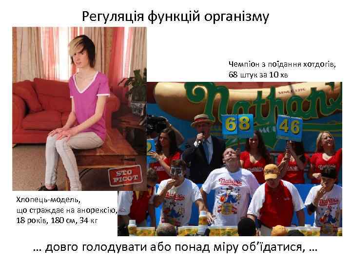 Регуляція функцій організму Чемпіон з поїдання хотдогів, 68 штук за 10 хв Хлопець-модель, що страждає на анорексію, 18 років, 180 см, 34 кг … довго голодувати або понад міру об’їдатися, …