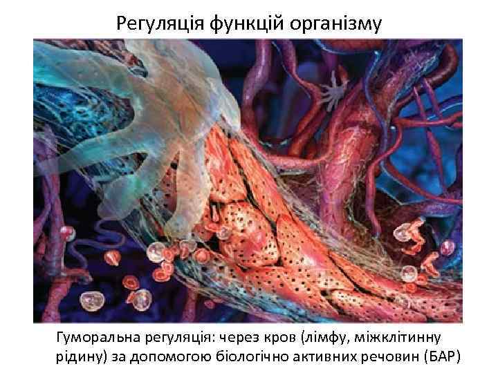 Регуляція функцій організму Гуморальна регуляція: через кров (лімфу, міжклітинну рідину) за допомогою біологічно активних речовин (БАР)