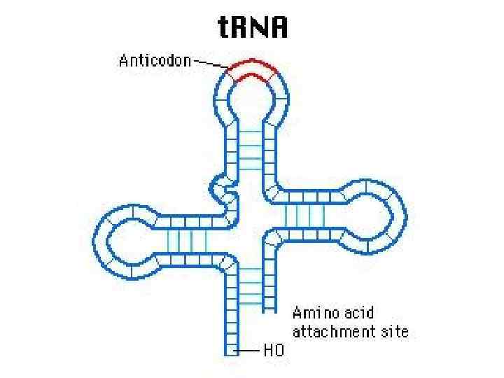 t RNA • t RNA is synthesized in nucleus but than remains in cytoplasm. • t RNA carries aminoacids from cytoplasm to ribosome. • Each t RNA can transfer only one kind of aminoacid. There must be 20 types of t RNA because there are 20 types of aminoacid.