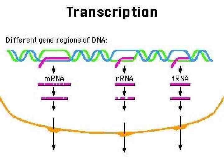 m RNA • All types of RNA are synthesized by DNA. Synthesizing of RNA from DNA is called transcription. Than m RNA moves to the cytoplasm. • Different m RNAs are transcripted from DNA for the synthesis of different proteins.