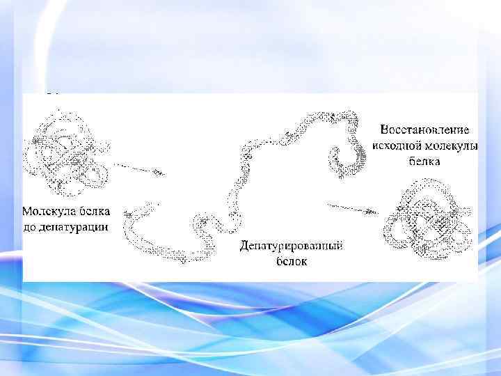 Денатурация. Резкое изменение условий, например, нагревание или обработка белка кислотой или щёлочью приводит к потере четвертичной, третичной и вторичной структур белка, называемой денатурацией. Самый известный случай денатурации белка в быту — это приготовление куриного яйца ОБРАТИМАЯ Если сохранена первичная структура НЕОБРАТИМАЯ Если первичная Структура разрушена