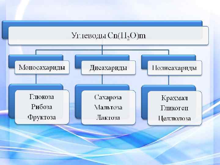 Углеводы, или сахариды, — органические вещества, в состав которых входит углерод, кислород, водород. Химический состав углеводов характеризуется их общей формулой Сm(Н 2 О)n, где m≥n. Количество атомов водорода в молекулах углеводов, как правило, в два раза больше атомов кислорода (то есть как в молекуле воды). Отсюда и название — углеводы. В живых клетка их содержание 1 -5%, в некоторых клетках может достигать 90%